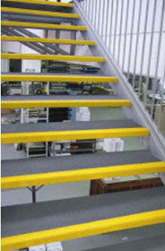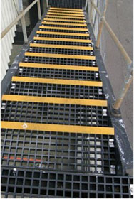 樓梯踏步采用高強玻璃鋼格柵,前緣制作不同顏色的防滑表面封閉條,產品可以固定在拉擠型材等及其他材質的樓梯結構上作為臺階。產品防滑,絕緣質輕,安裝方便,在所有的工業環境作為安全防護使用效果良好。